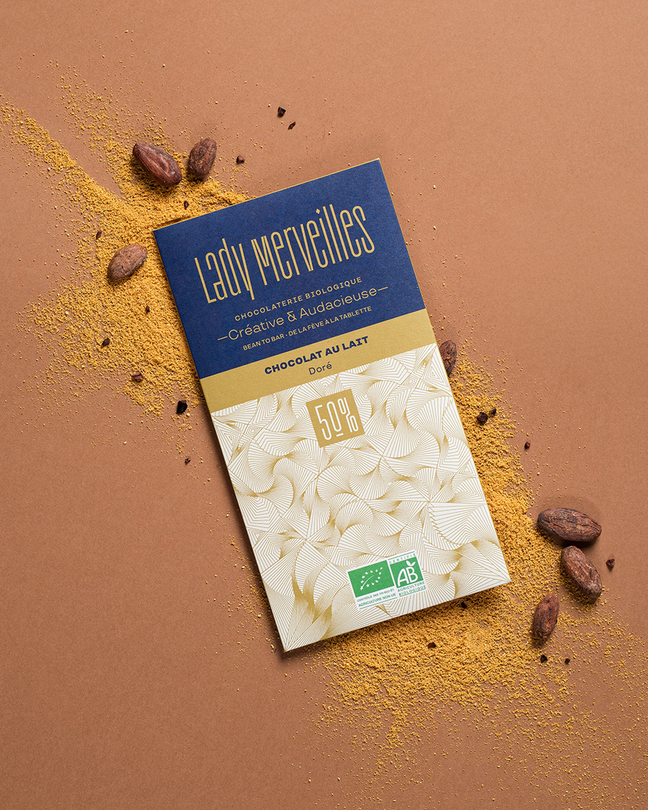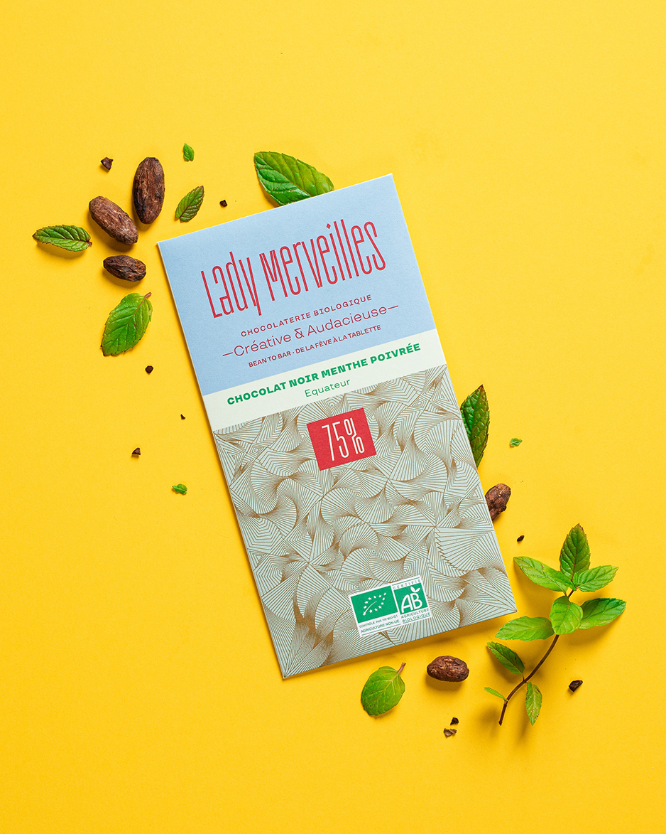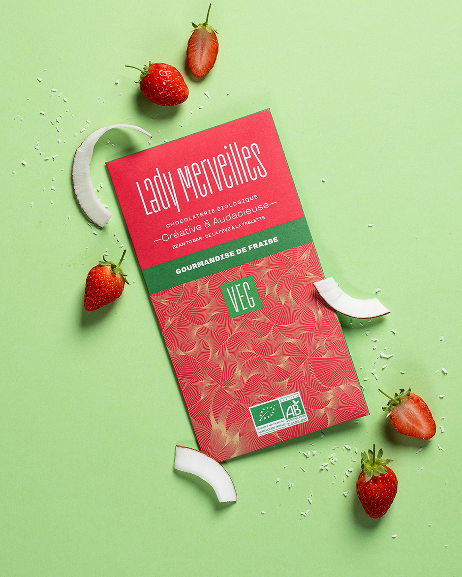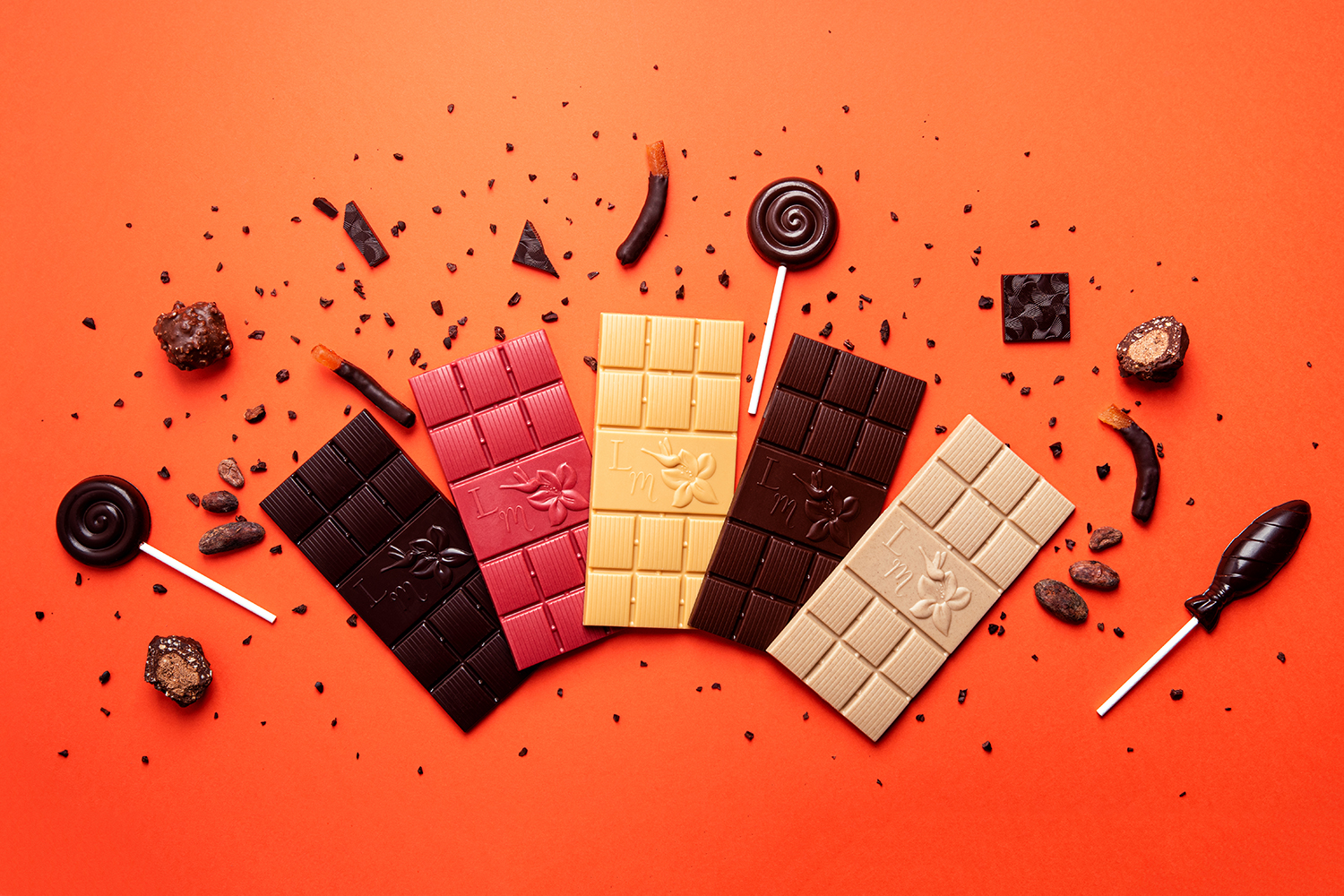 Photographie des différentes gammes de tablettes de chocolat et autres produits gourmands. Chaque gamme de tablette se voit attribuer une couleur de fond différente, avec un rappel d’ingrédients bruts la composant.