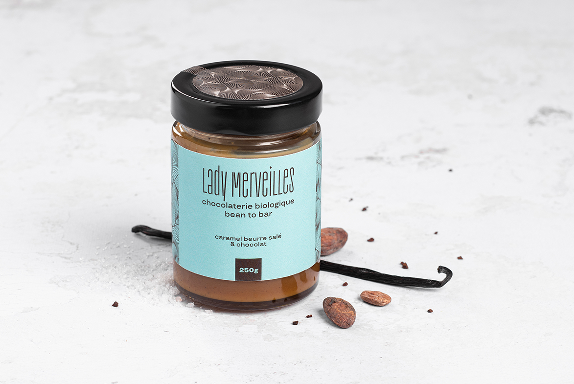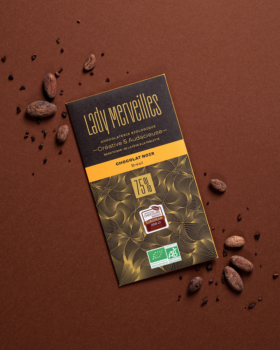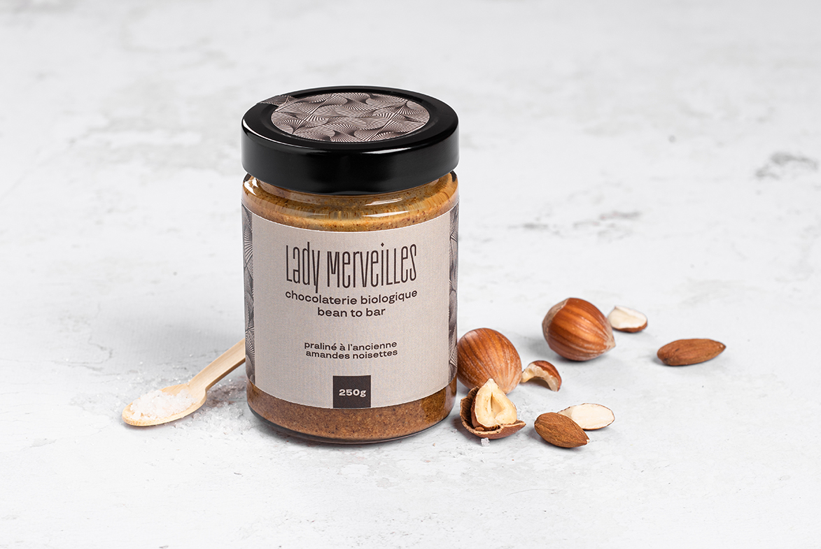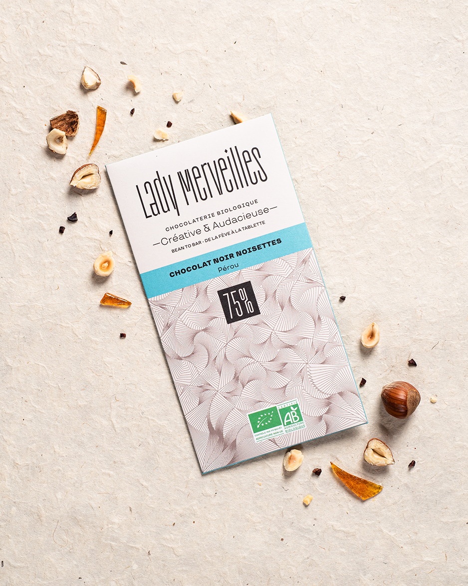 Photographie des différentes gammes de tablettes de chocolat et autres produits gourmands. Chaque gamme de tablette se voit attribuer une couleur de fond différente, avec un rappel d’ingrédients bruts la composant.