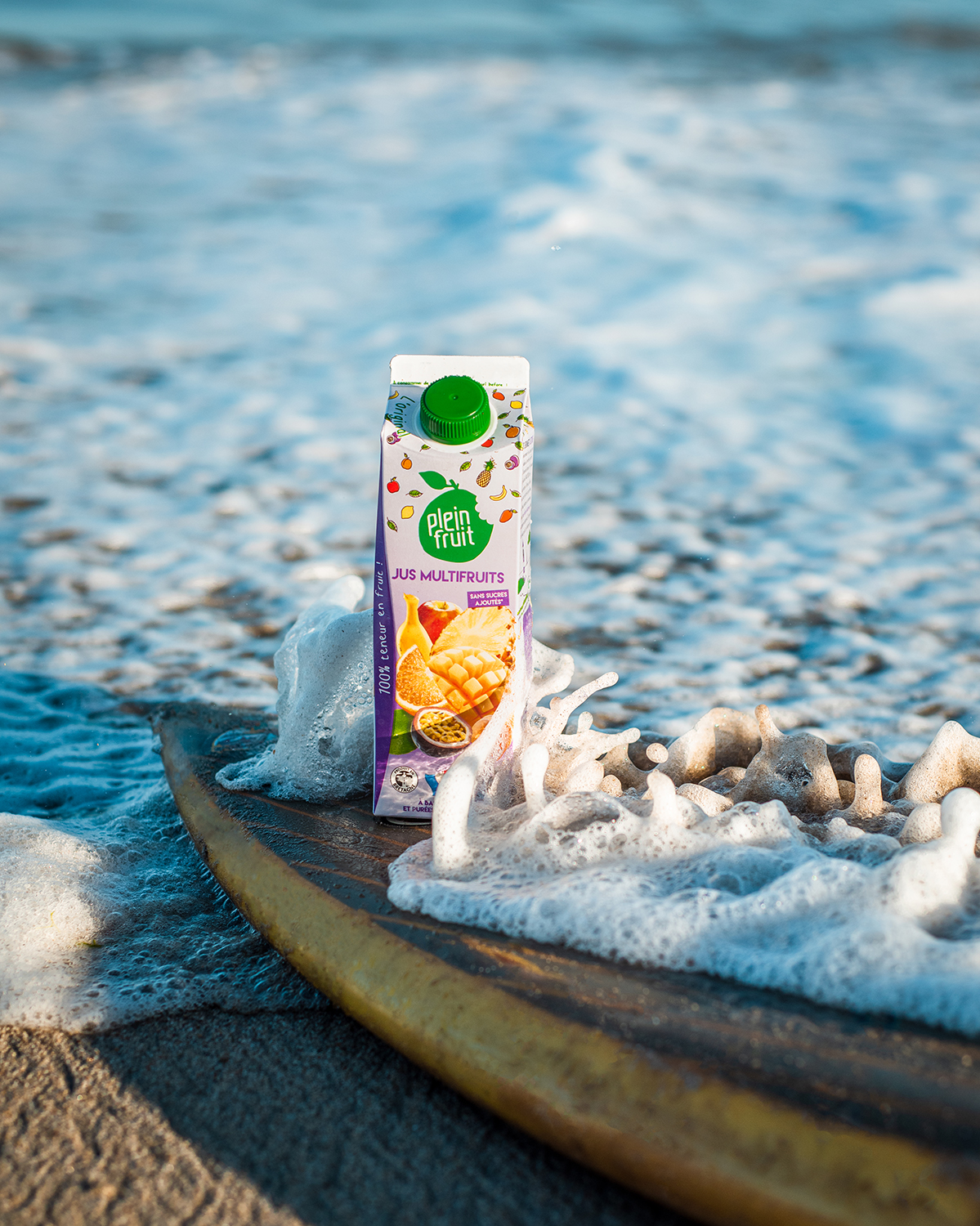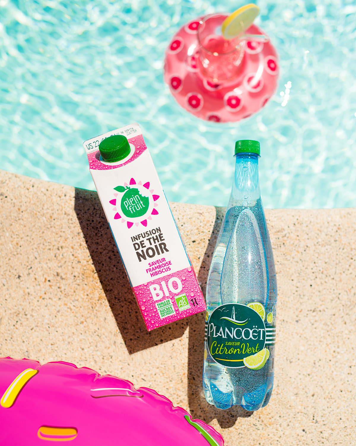 Mise en ambiance outdoor de packs produits pour la marque Plein Fruit. Brief requérant 3 ambiances différentes : farniente au jardin / au bord de la piscine / surf. Photographies à destination des Réseaux sociaux de la marque.